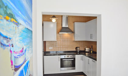 A quality modern kitchen with built-in microwave, full sized dishwasher, electric oven, fridge freezer and all essential small appliances. Washing machine, Iron & Ironing board supplied